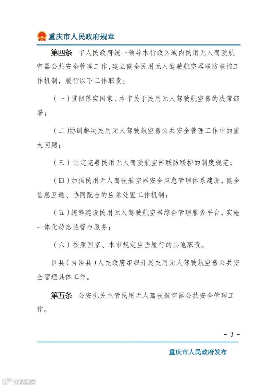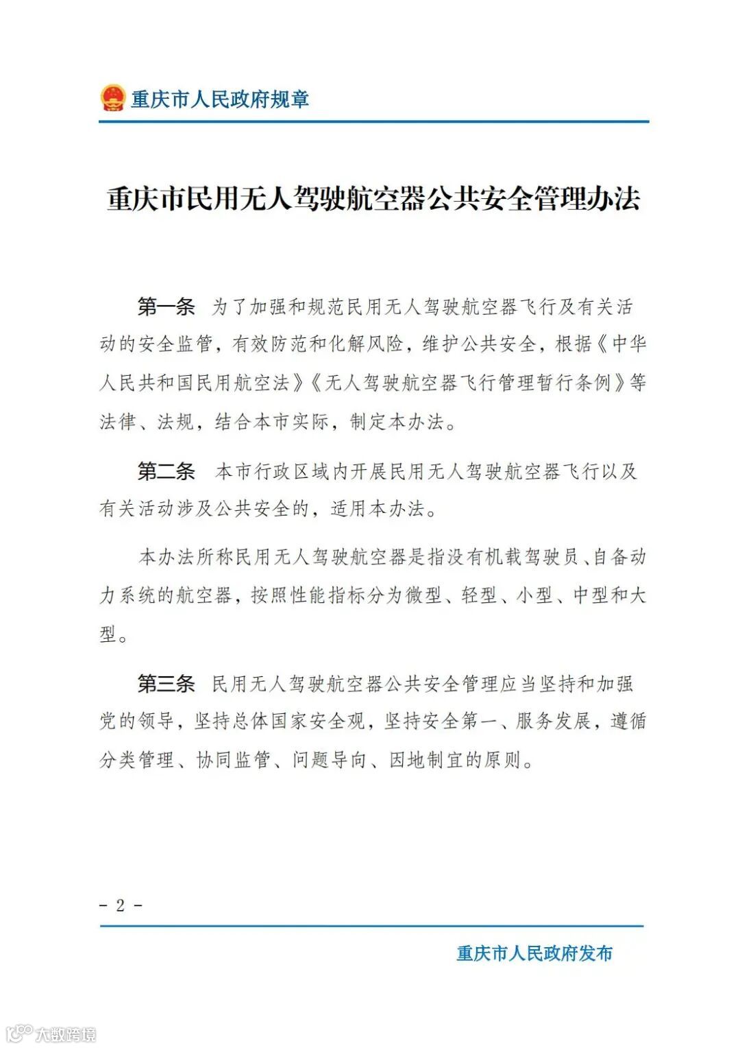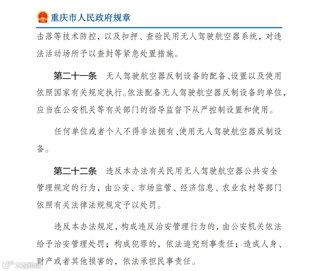 近日,重庆市政府公众信息网发布《重庆市民用无人驾驶航空器公共安全管理办法》。
