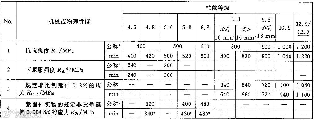 ▲表 不同性能等级螺栓、螺钉和螺柱的主要机械性能(摘自GB/T3098.1)
