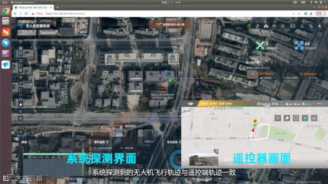 同时,系统可对无人机及飞手进行实时定位及轨迹跟踪,系统探测到的无人机飞行轨迹与遥控端轨迹一致