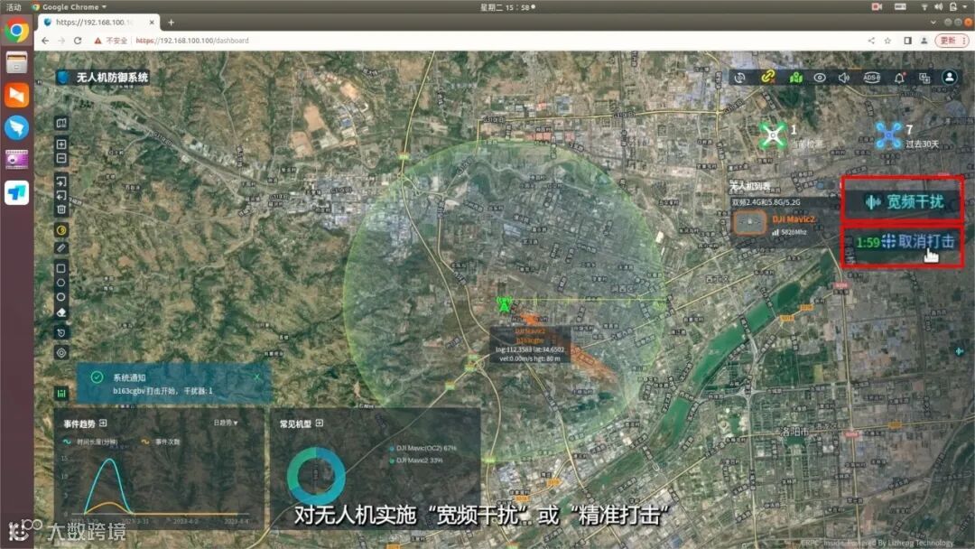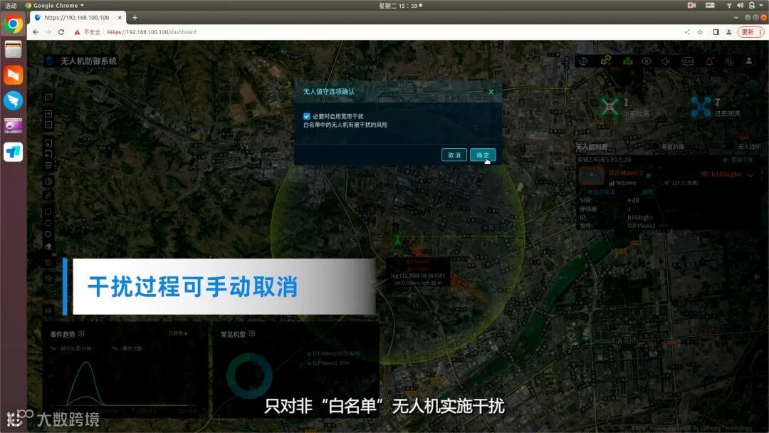 探测到无人机时,系统将自动报警,主界面显示探测到的无人机数量、机型、频点、方位、高度等信息,系统侦测的电子id号与无人机机身识别码一致