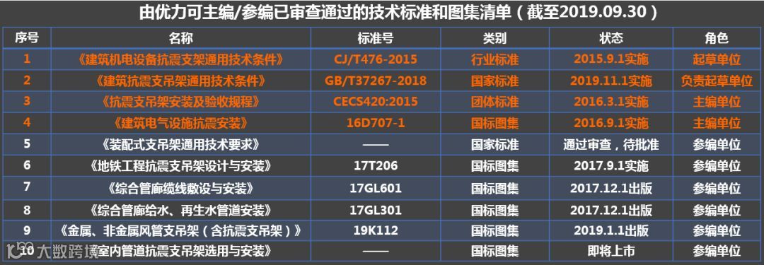 截至目前,优力可科技主编和参编装配式支吊架领域标准和图集共计14项,其中13项为新编标准,填补行业空白,具有重要的开创性意义,主编国家标准1项、行业标准1项、团体标准1项、国标图集1项,参编国家标准1项、团体标准3项、国标图集6项。