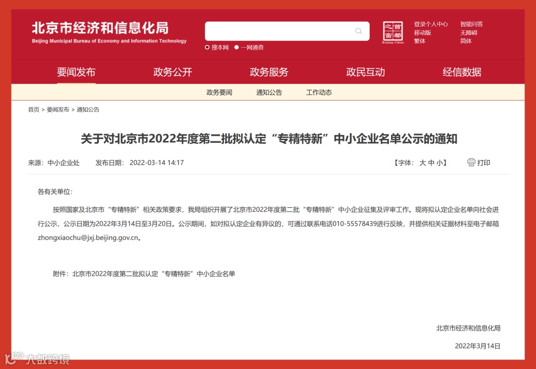 2022年03月14日,北京市经济和信息化局发布通知,历正科技被认定为“专精特新”企业,向社会进行公示。