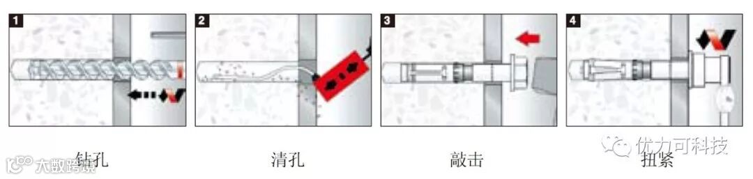 1. 锚栓打孔时应注意深度与垂直度,以自切底锚栓M12x80mm为例,钻孔深度在≥85mm,应保证孔位与楼板垂直度在±3°。