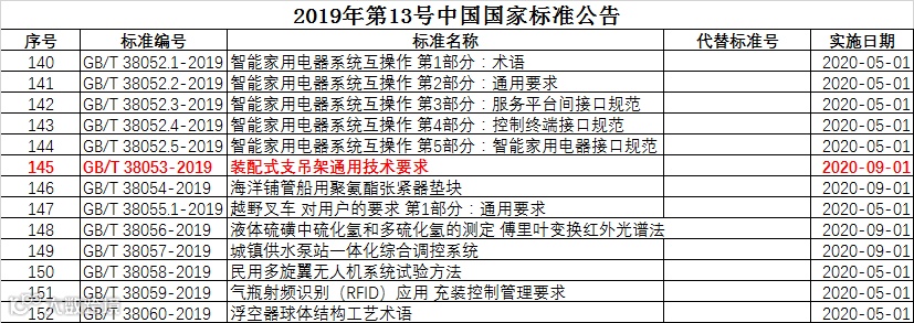 2019年10月18日,国家标准委发布2019年第13号中国国家标准公告,国家标准《装配式支吊架通用技术要求》标准号为GB/T38053-2019,将自2020年9月1日起实施。
