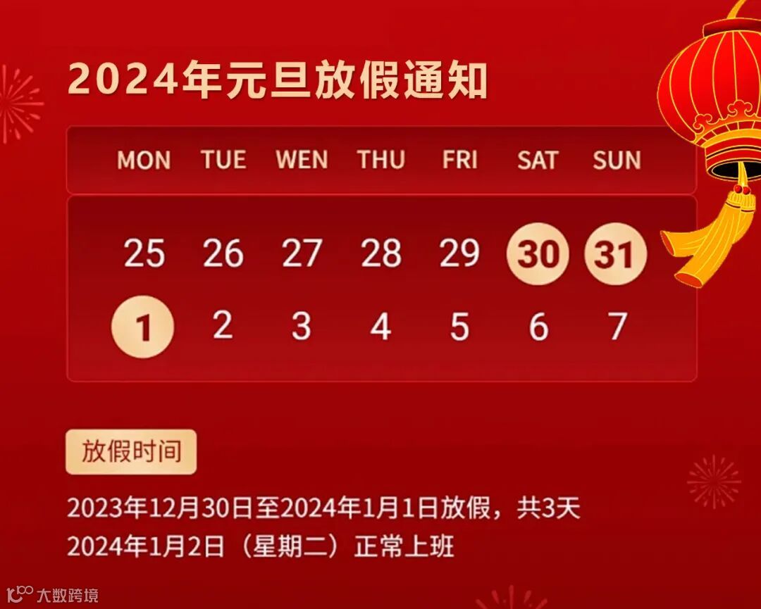 2023年12月30日(周六)至2024年1月1日(周一)放假,共3天。
