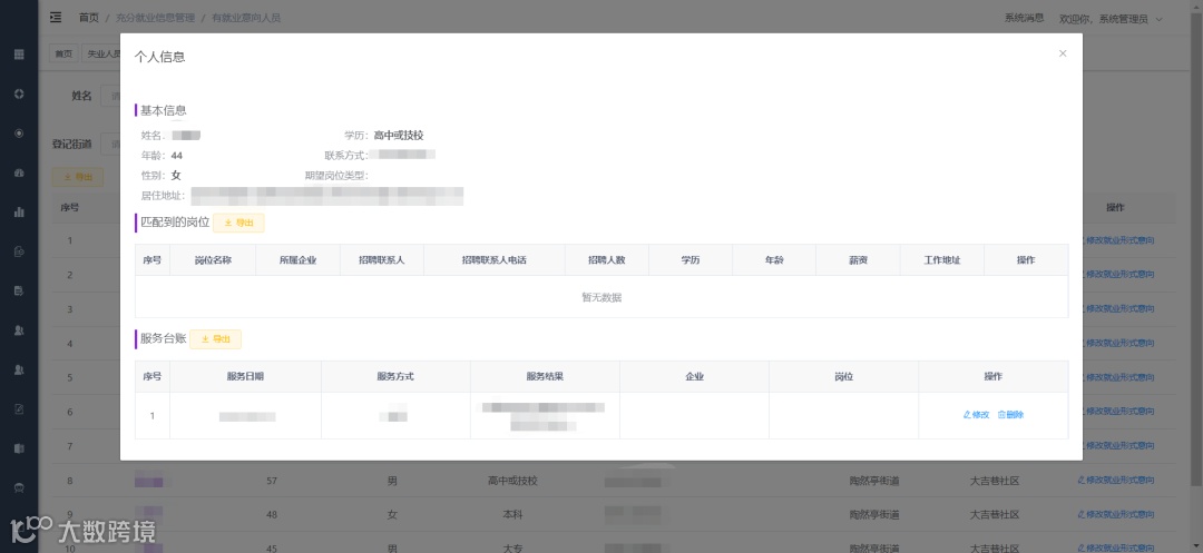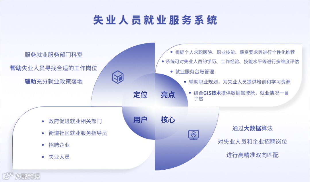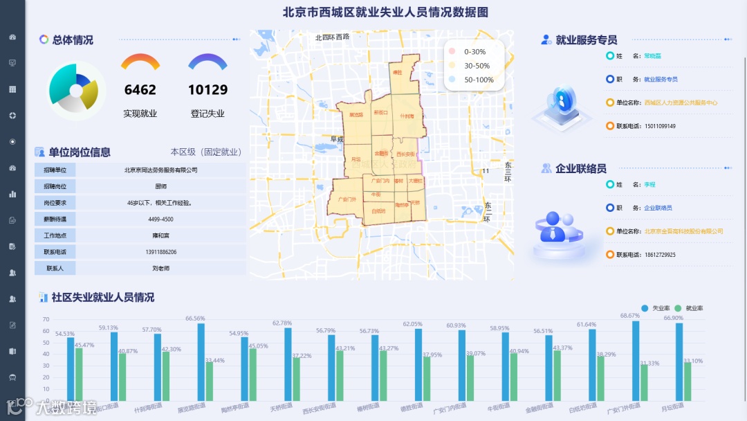 系统采用人员与岗位双向匹配,不仅提供职业培训帮助,让求职者了解自己的职业兴趣,确定职业方向;还可提供最新的招聘信息和职业发展信息,帮助求职者了解市场需求和职业趋势;也会提供职业技能培训和职业素质培训;还为企业提供招聘咨询、人才推荐,帮助企业招到合适的人才;以及结合GIS技术的数据驾驶舱,全方位助力就业服务工作。