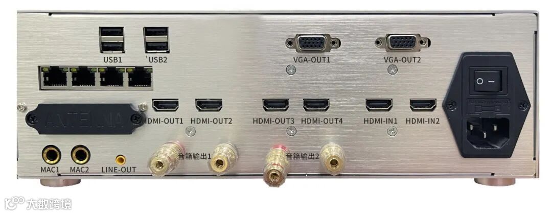 接口丰富,支持2路麦克风同时接入;支持1路千兆网接口输入+3路输出;支持4路HDMI输出+2路HDMI输入;
