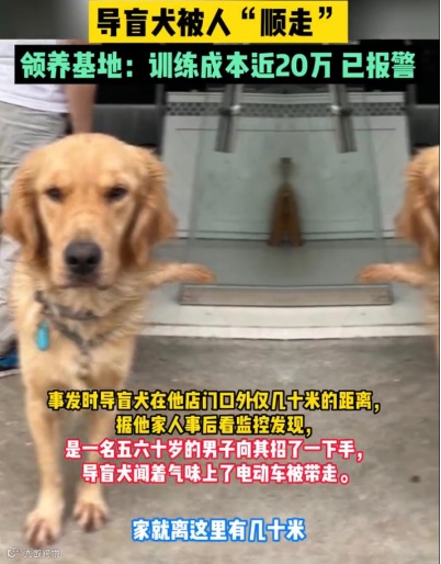 最近便有一则关于导盲犬丢失的新闻,安徽宿州江先生申请三年,于今年三月份刚从中国导盲犬大连培训基地领养的导盲犬被一中年男子偷走。偷盗者为了谋取一时私利,欺负盲人行动不便,将他们赖以生活的导盲犬盗走,侵蚀了珍贵的社会资源,简直是突破了道德的下限,令人愤怒不齿。不过还好导盲犬多斯特已经平安回家。