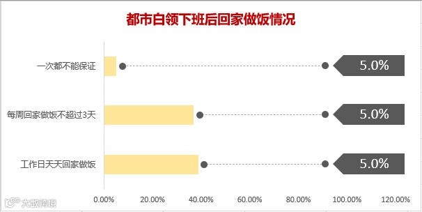 根据相关数据显示,北上广深这样的一线城市,不足四成的白领能够保证工作日晚上是自己在家做饭,其中74.1%的白领是以“工作忙,没时间”作为理由,还有人则是因为本身懒得做饭。