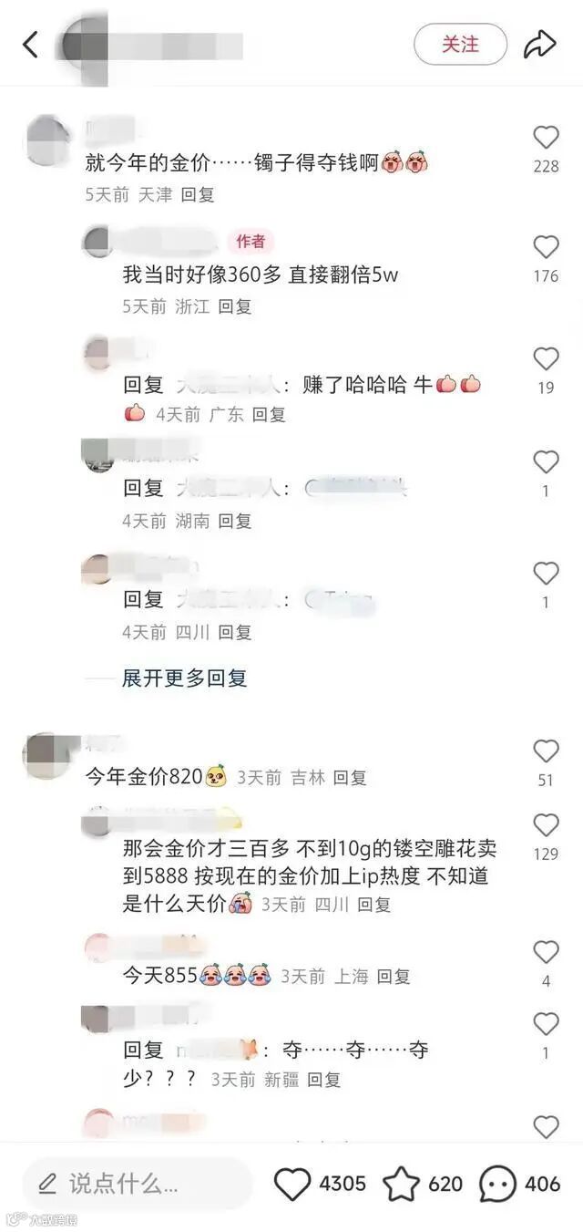 随着近期市场黄金从5年前的约400元/克涨至超800元/克,这款吒儿同款手镯的价格也狂飙猛涨。消费者纷纷在二手平台求购,表示后悔当初没买。