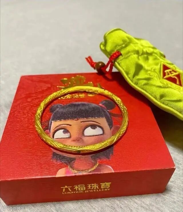 在电影里,乾坤圈这一黄金打造的镯子是哪吒从小佩戴的首饰,也是他常用的武器之一。2020年,某黄金品牌与《哪吒1》联名推出了复刻版足金首饰周边。