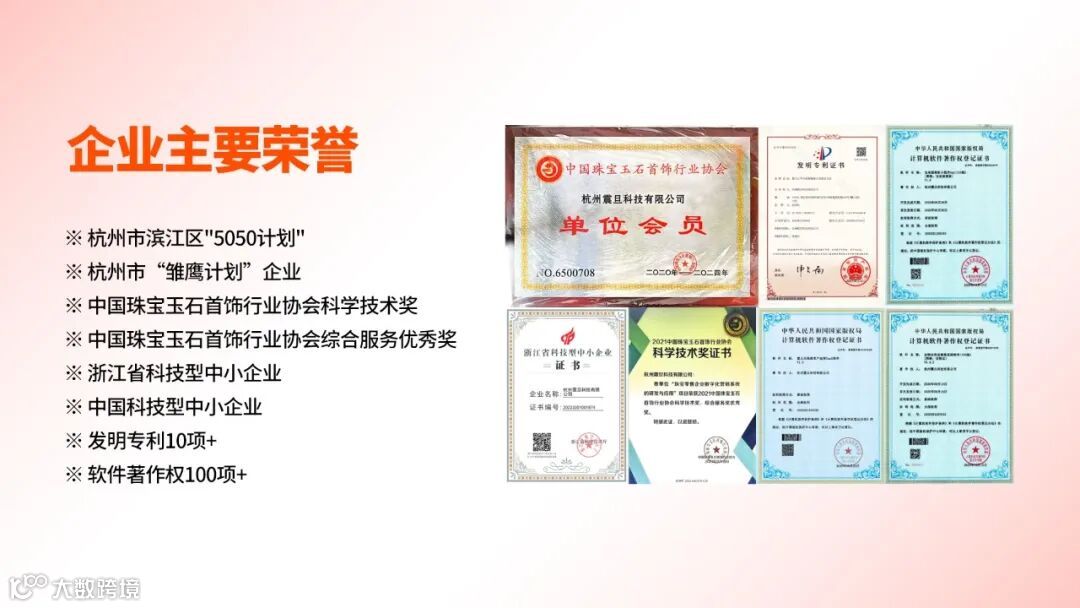 经过多年的发展与迭代,震旦科技通过交易服务平台和利用自研数字智能模型(SAAS系统——全链数智云),帮助行业上下游产业链提供市场营销、客户关系管理、商品管理、库存管理、人力财税、用户体验等全方位的数字化服务。截至 2025 年,平台已服务60000 + 用户,覆盖全国超 10 万+黄金珠宝门店,累计交易额超100亿元。震旦科技凭借在珠宝行业多年的耕耘与创新,荣获“科技型中小企业”等多项认证与大奖称号,以及获得超100项软件著作权与专利,有力推动黄珠宝行业数字化转型。