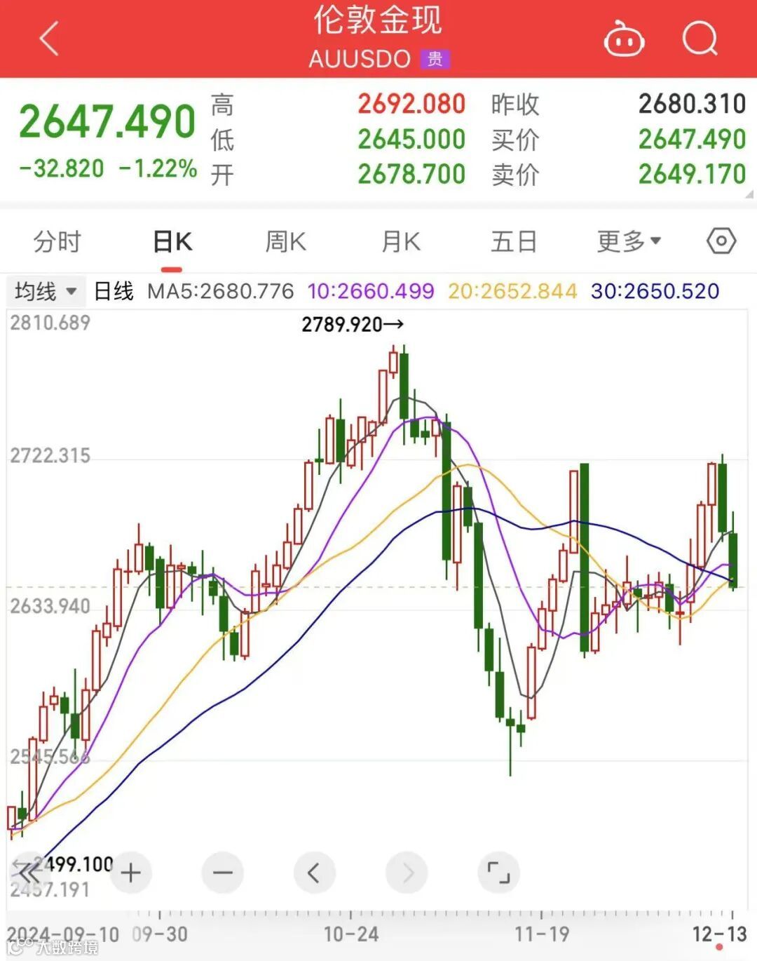 现货黄金最低下探至2645美元/盎司,单日跌幅为1.22%,收于2647.49美元/盎司。