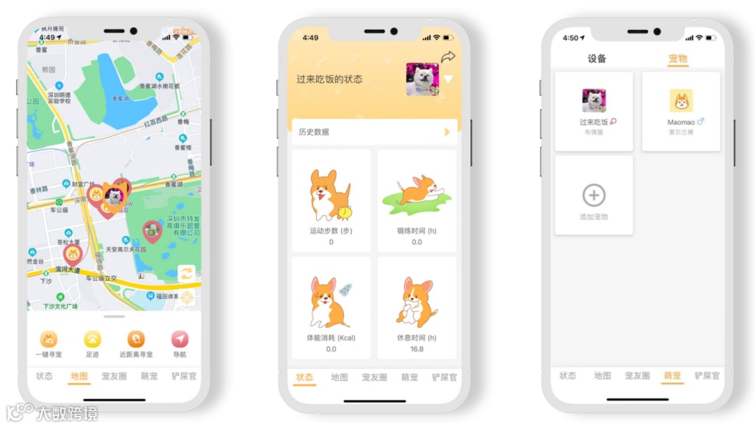 通过响铃和灯光更快找到走失的宠物,宠物每天的运动数据一目了然; -