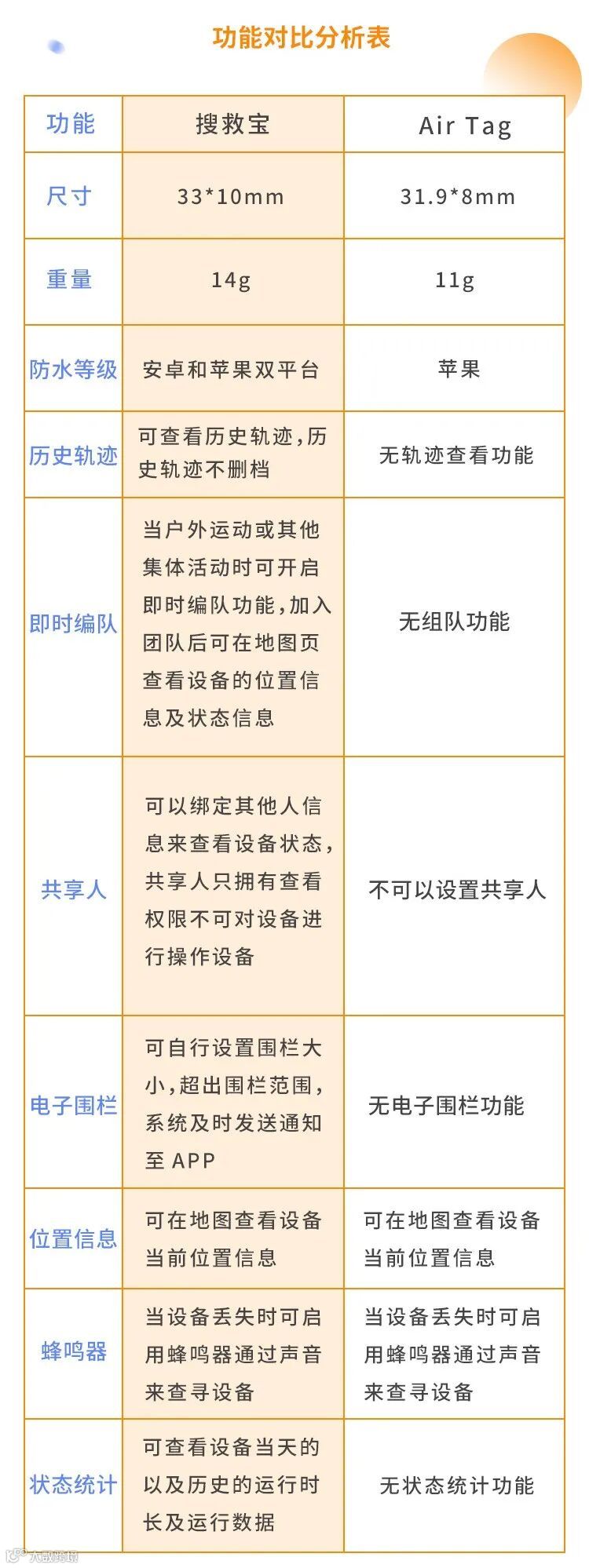 综合以上功能点来看,搜救宝定位器相较于AirTag功能点来说会更加丰富一些,首先对于用户的使用权限没有平台限制,其次在功能点上搜救宝定位器可以查看历史轨迹、设置电子围栏范围、用于多人活动的即时编队功能、可绑定多个共享人以及设备的一个运行状态的查看。