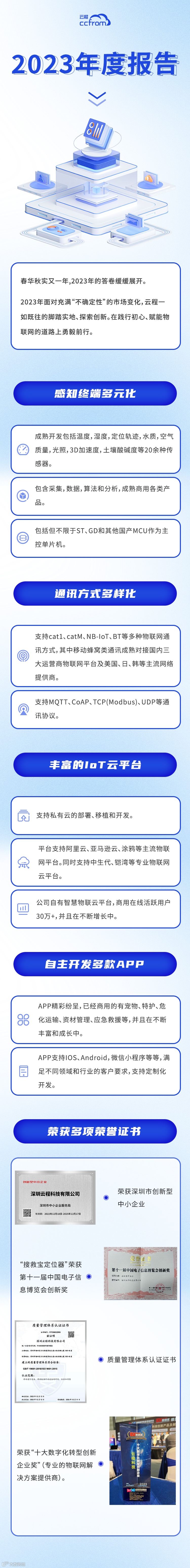 云程科技位于深圳市福田区安徽大厦创展中心,是国家高新技术企业,是一家专注于提供物联网菜单式解决方案的公司,提供全面的感知(信号采集、传感器)及数据分析、通讯、平台和APP一体化的解决方案。产品广泛应用于工业控制、智慧农业、养殖、养老、交通运输、特种人员管理等智慧城市的许多方面。通过创新技术和专业团队,我们帮助传统产业的客户实现产业及产品的智能化、互联化和高效的业务运营。公司在物联网领域拥有众多自主知识产权,并与多家国际企业开展广泛合作。公司也是华为在蜂窝物联网领域的战略合作伙伴。