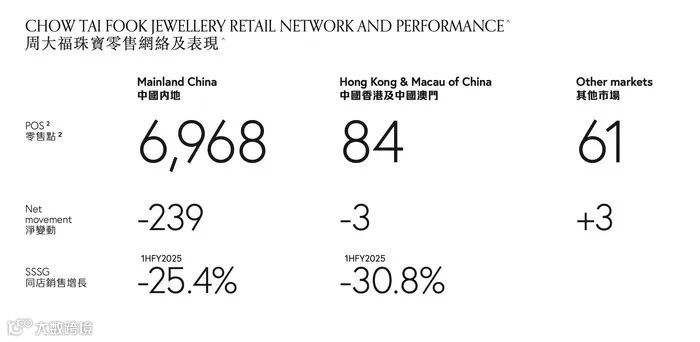 报告显示,截至2024年9月30日,周大福营业额同比下降20.4%至394.08亿港元,同店销售表现低迷,中国内地市场同店销售同比下降25.4%,中国香港及澳门市场则下降30.8%。周大福在半年内关闭239家门店,尽管此举被称为“优化零售网络”,但对市场信心的提振作用有限。