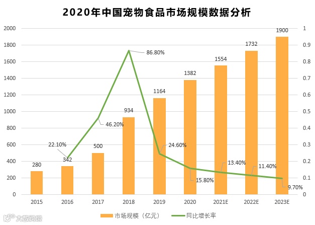 2020年我国宠物食品市场规模约为1382亿元,宠物主粮占绝大部分,宠物零食分散的比较多。预计2021年国内宠物食品的行业规模可以达到1554亿元。