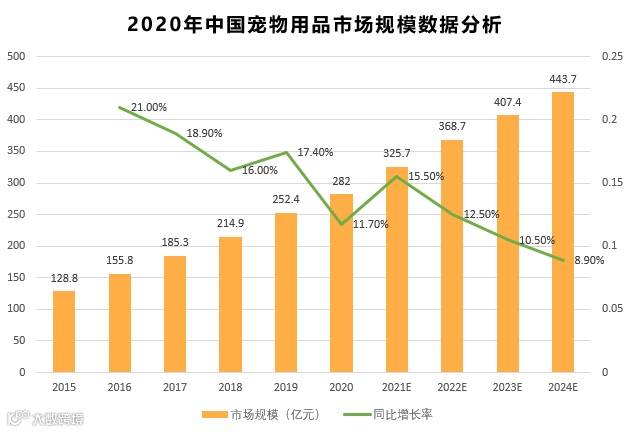 随着宠物经济的快速发展,宠物用品的细分也随之兴起,一些能够满足消费者需求的宠物特色产品也慢慢稳定市场,成为带动宠物市场发展的增量。届时,国内宠物用品市场将进一步扩大,预计到2024年,中国宠物用品市场可以达到443.7亿元,同比增长在9%左右。
