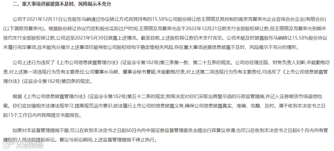 其次,莱绅通灵在重大事项进展披露上也存在不及时、风险揭示不充分的问题。这主要涉及公司主要股东股权转让事项。2021年12月31日,公司曾公告称,股东马峭通过协议转让方式将其持有的15.58%公司股份转让给王丽丽及其控制的南京克复荣光企业咨询合伙企业(有限合伙)。然而,根据股份转让协议约定和股份实际过户时间,王丽丽及克复荣光应于2022年12月21日前支付全部股权转让款,但到期未按约支付。莱绅通灵直至2023年5月30日才披露上述情况,且至今股权转让款仍未支付完毕。江苏证监局认为,公司未能及时披露这一重要事项的进展,且未能充分揭示相关风险,存在信息披露不及时、风险揭示不充分的问题。