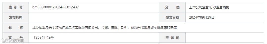 日前,知名珠宝上市公司莱绅通灵(603900.SH)因信息披露违规问题被江苏证监局处以行政监管措施。公司公告显示,因2022年年度报告财务信息披露不准确、重大事项进展披露不及时、风险揭示不充分等问题,江苏证监局对莱绅通灵及其四大高管采取出具警示函的行政监管措施,并记入证券期货市场诚信档案。这一处罚不仅揭示了公司在信息披露方面的严重问题,也再次将莱绅通灵近年来经营业绩不佳的现状暴露在公众视野之下。