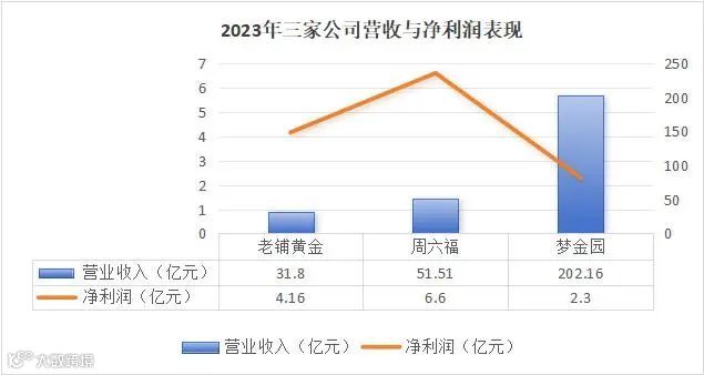 透过上述财务数据可以看出,梦金园的营收体量最大,但净利润规模不及周六福;老铺黄金营收水平虽远不及梦金园、周六福,但其2023年度营收增速最高,且毛利率更胜一筹。