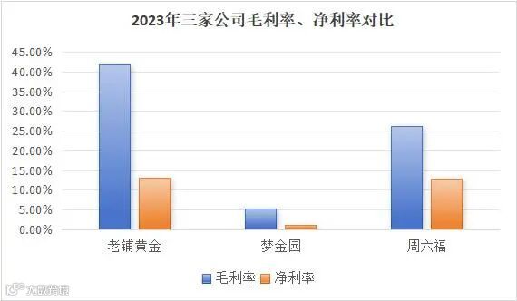 2021-2023年,老铺黄金的毛利率分别为41.2%、41.89%、41.89%;周六福的毛利率分别为35.02%、38.69%、26.23%;梦金园的毛利率分别为3.18%、4.83%、5.33%。