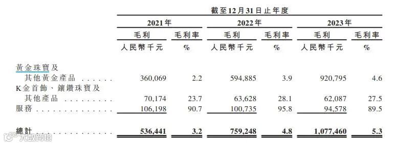 据招股书披露,2023年,公司足金黄金产品的克均价为729元;镶嵌了钻石、绿松石、珍珠等其他材料的足金镶嵌产品,克均价达到1043元,毛利率较足金产品更高。