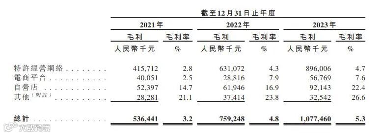 公司加盟模式的毛利率相对较低,以2023年为例,特许经营网络的毛利率为4.7%,自营店的毛利率为22.4%。