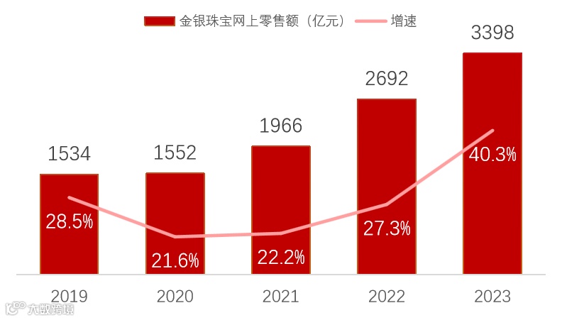 2023年,我国珠宝电商销售额约为3,398亿元,同比增长40.3%。国家统计局数据显示,2023年全国网上零售额达15.4万亿元,同比增长11%。在中华人民共和国商务部重点监测的18类商品中,2023年有6类商品零售额增速超过两位数,其中金银珠宝类商品以40.3%的增速领先于其他商品。