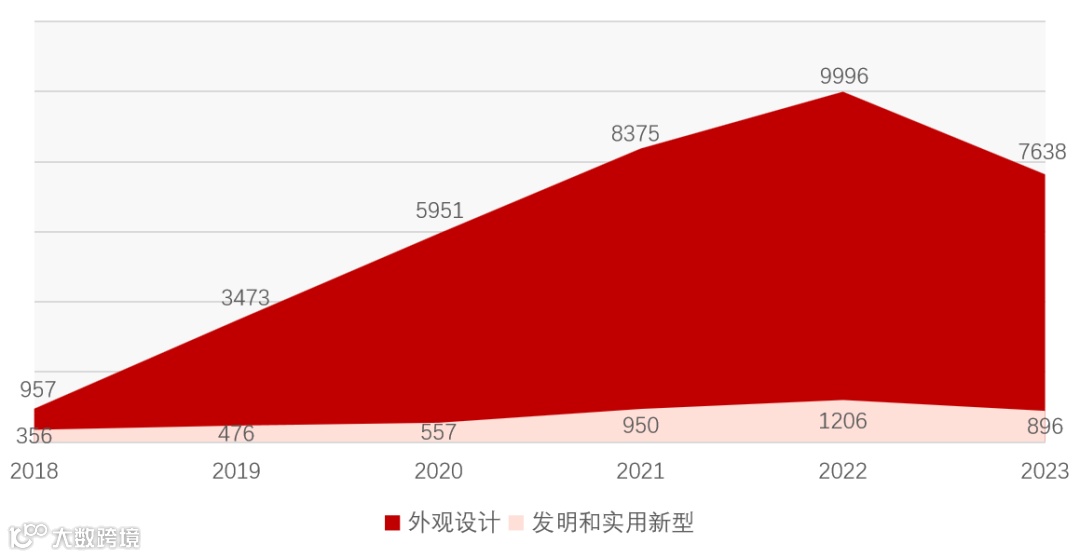 2018—2023年珠宝行业外观设计、发明和实用新型专利总数