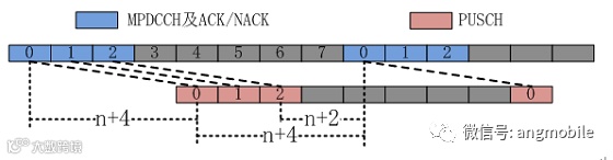 图2是信号条件较好的环境中,最优的上行调度时序,终端接收到MPDCCH调度后,必须等待4个子帧才能进行MPDCCH所调度的上行PUSCH数据发送,并且,上行/下行发送的切换间隔必须至少占用1个子帧。从PUSCH上行数据发送到基站在MPDCCH中进行ACK/NACK确认也需等待4个子帧。