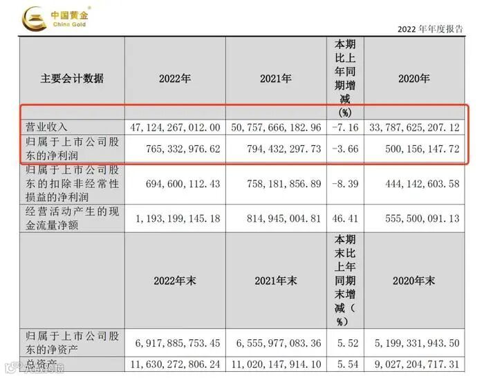目前2023年财报尚未披露,仅有2022年财报中的详细数据可供参考,据中国黄金2022年财报显示,公司营业收入471.24亿元,同比下降7.16%。归属于上市公司股东净利润为7.65亿元,同比下降3.66%