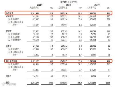 2022年至2024年,周六福加盟模式的收入占总收入的百分比分别为52.9%、55.4%、50.5%,相比首次A股上市尝试的往绩记录期间有所下降。
