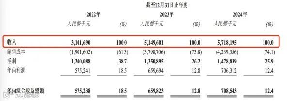 财务数据方面,2022年至2024年,周六福的营收分别约为31.02亿元人民币(下同)、51.50亿元和57.18亿元,复合年增长率为35.8%。其中,电商销售板块收入的复合年增长率达到了46.1%。净利润由2022年的5.75亿元增至2024年的7.06亿元,复合年增长率为10.8%。