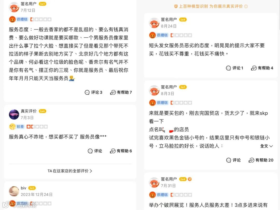 我们在大众点评的确看到,几乎所有奢侈品店相关点评下都有大量差评,问题多集中在服务态度上。
