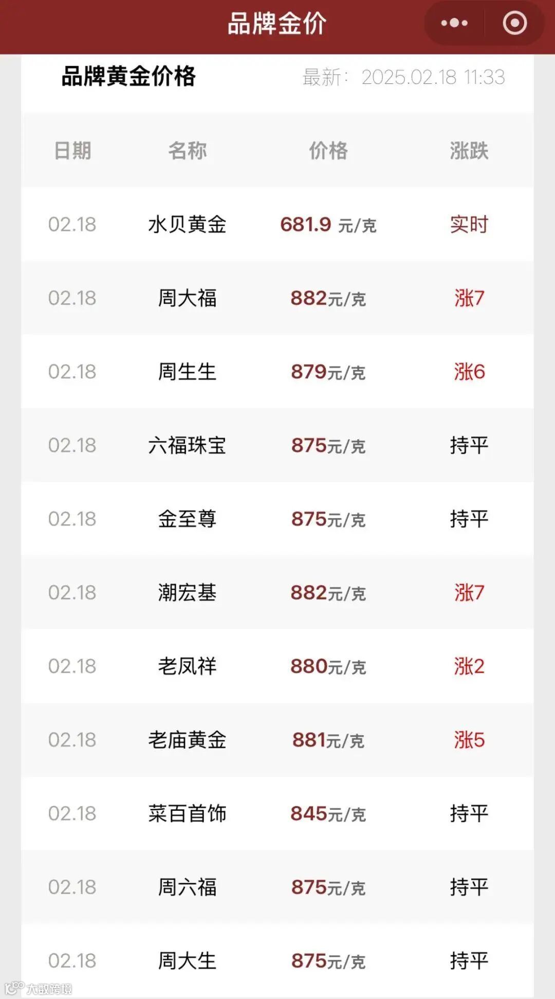 △2月18日,周大福、潮宏基等品牌价格均超880元/克