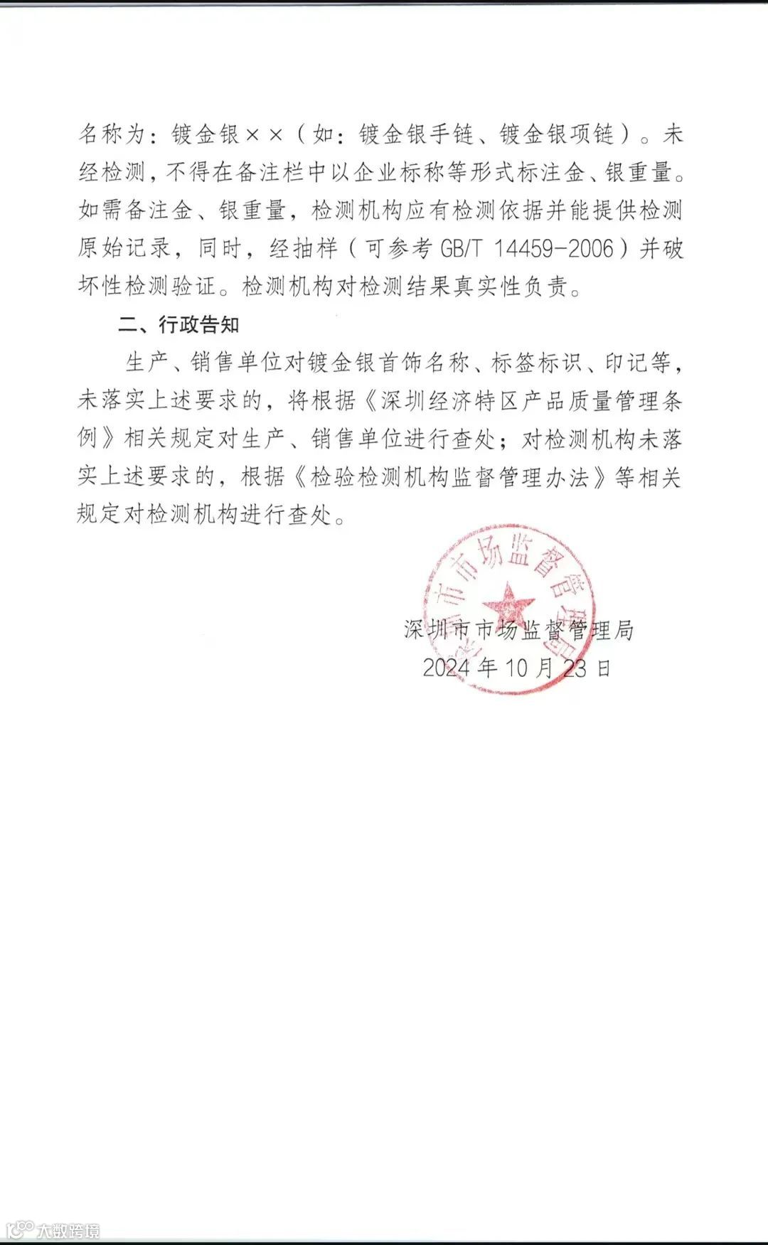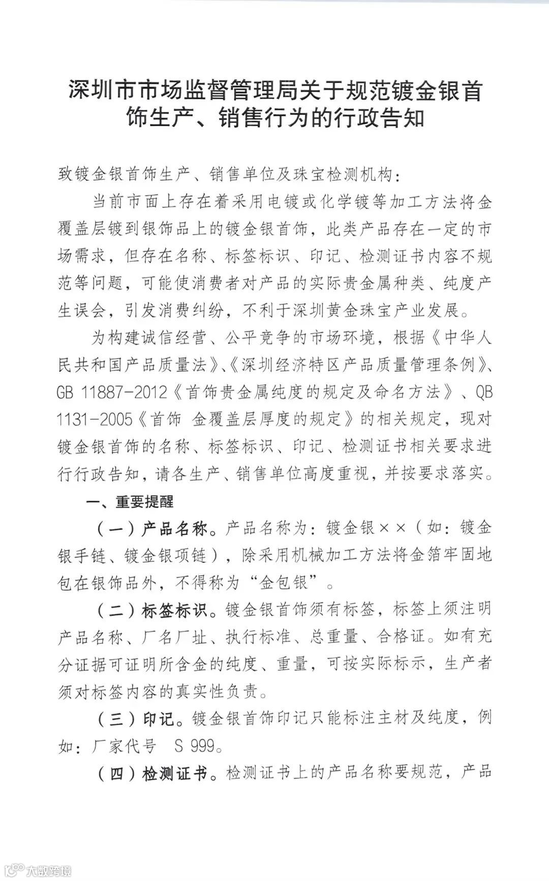 为了规范市场秩序、保护消费者权益、促进黄金珠宝产业的健康发展,深圳市市场监督管理局,于近日发布了《关于规范镀金银首饰生产、销售行为的行政告知》,依据相关规定对镀金银首饰的名称、标签标识、印记、检测证书相关要求进行行政告知,请各生产、销售单位高度重视,并按要求落实。