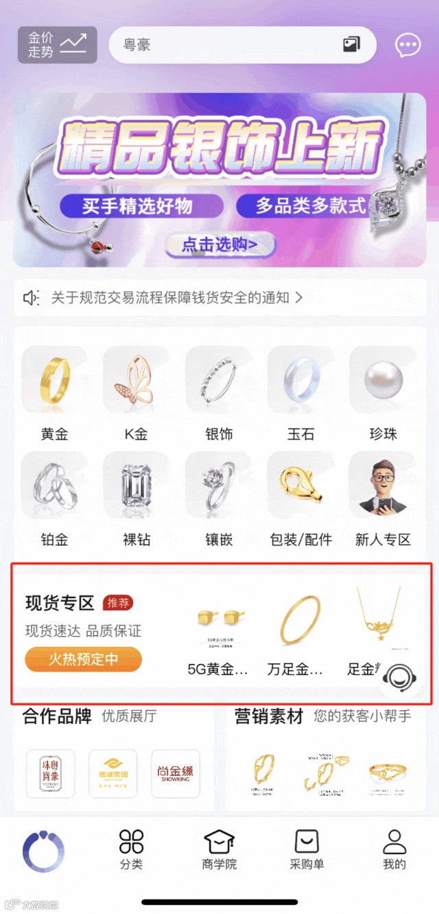 实时库存显示,省去和客户经理沟通确认环节,珠宝商家可独立完成下单,30分钟内即可付清货款,当日发货。