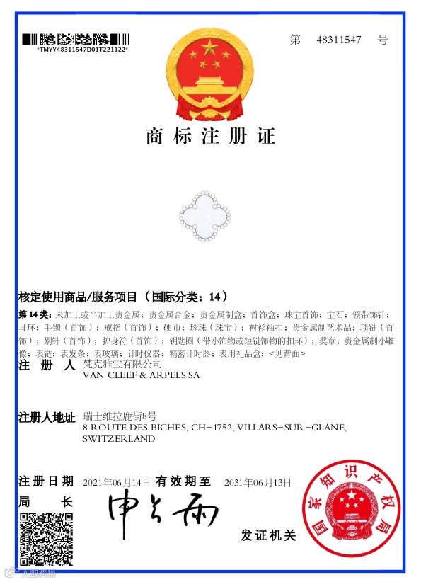梵克雅宝品牌代表及其代理律师在会上表示,梵克雅宝公司“四叶幸运”系列的第48311547号商标于2021年6月14日获准注册,有效期至2031年6月13日。