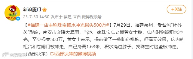 7月29日,泉州南安市一家珠宝店接受媒体采访时称店内财物被积水冲走,至少损失500万的说法引发关注。不少网友对于店方损失500万的说法表示了质疑。