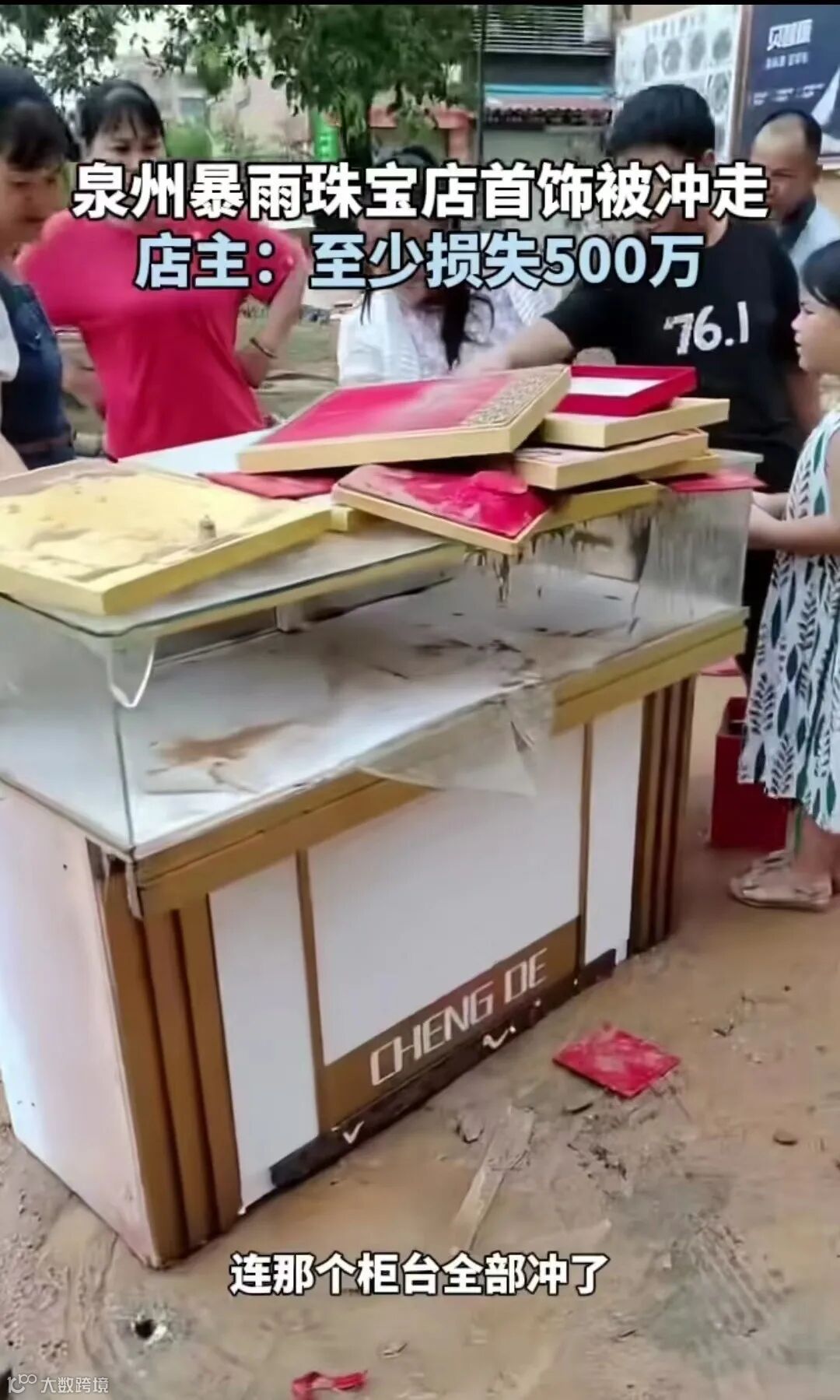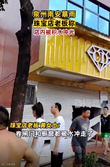 7月29日,有网友发布视频称,福建南安市榕桥街一珠宝店的珠宝被洪水冲走,现场有人在凑热闹捡珠宝。根据视频显示,在一家珠宝行附近,树枝、砖头等杂物散落一地,珠宝店的卷闸门显示已损毁,柜台出现在了店铺外,现场有多名群众正在围观。