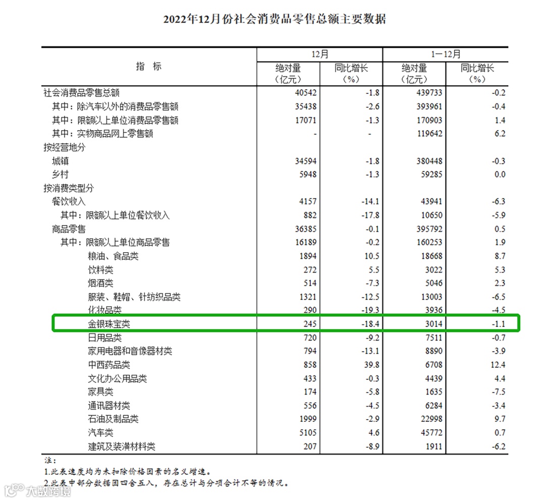 国家统计局数据显示,2022年全年限额以上单位金银珠宝类零售总额达3014亿元,同比(名义)下降1.1%,而相较2020年已有较大幅度的回弹。