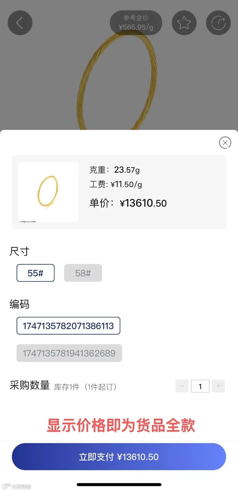 根据现货克重及工费信息,采用实时金价计算商品总价,采购成本更直观,选中商品即可一键付全款,锁定商品极速出货。优化“定金+全款”的两步支付操作,支付流程更便捷,线上采购更丝滑。