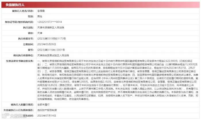中国执行信息公开网显示,目前恒信玺利存在多条被执行人信息,恒信玺利和李厚霖也多次收到限制消费令。