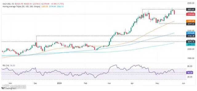 Valencia称,金价的首个支撑位将是5月13日低点2332美元/盎司,随后是5月8日低点2303美元/盎司。一旦跌破水平,50日简单移动平均线(SMA)2284美元/盎司将是下一个看空目标。