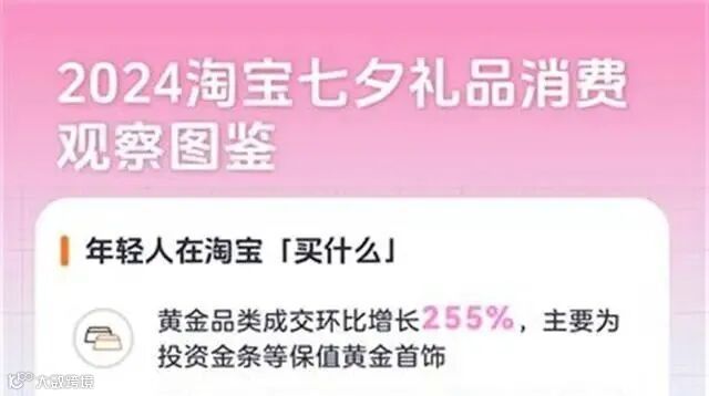 近日,淘宝发布2024七夕礼品消费观察图鉴,公布了七夕十大热门礼品,其中,具有投资价值的“黄金大饼”跻身十强榜单。