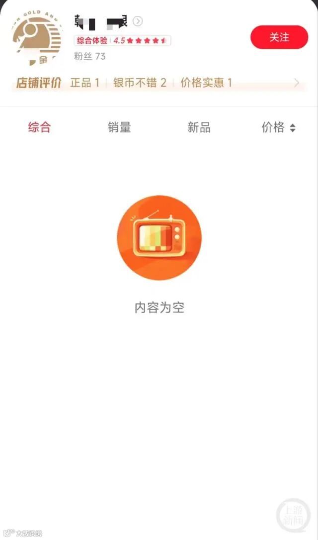 16日上午,记者在淘宝上搜索该店铺发现,店内所有商品已经下架,显示“内容为空”。数据显示,该店铺有73名粉丝,得分为4.5分,收到的评价包括“正品”“银币不错”“价格实惠”等。天眼查APP显示,该店铺所属公司为“乾X金银实业(深圳)有限公司”,注册地址为深圳市龙岗区某工业区,法定代表人为马某某。