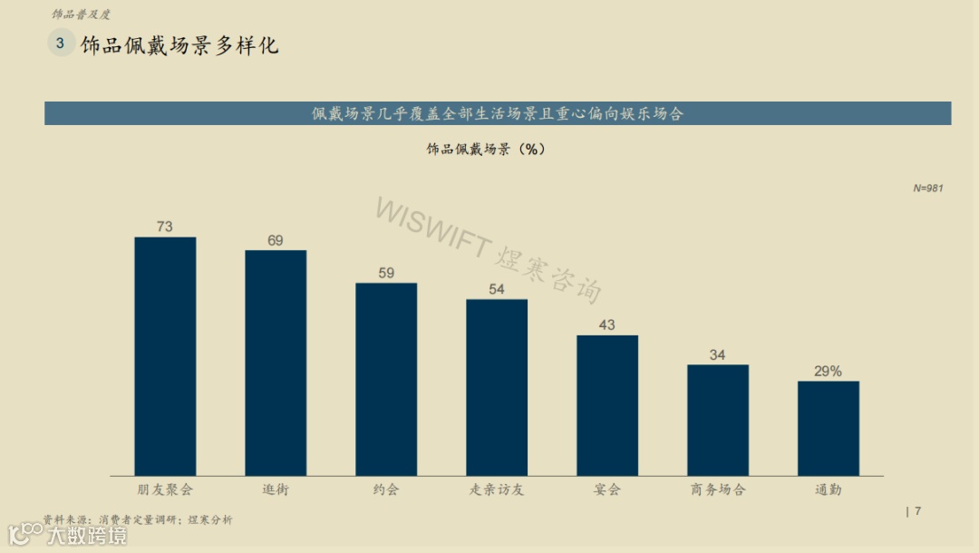 《报告》指出,饰品目前在女性用户中渗透率高,超过60%的被访者每周有3天以上会佩戴饰品,但“00后”佩戴饰品频率最低。在饰品佩戴场景方面,几乎覆盖全部生活场景,如朋友聚会、逛街、约会、走亲访友、宴会、商务场合等,且重心偏向聚会、逛街、约会等娱乐场合。