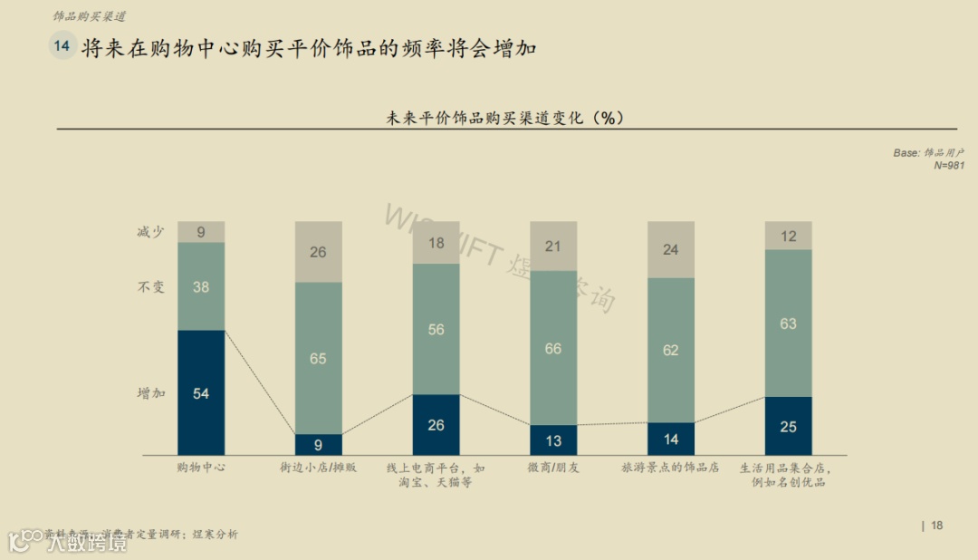 《报告》特别强调,消费者整体对新兴饰品品牌接受度高,年轻消费者相对更容易接受、更换新品牌,而随年龄增大,会逐步固定几个主要购买的品牌。将来在购物中心购买平价饰品的频率将会增加,增幅达到54%,比线上电商平台、微商、旅游景点饰品店增幅总和还要高出1个百分点。